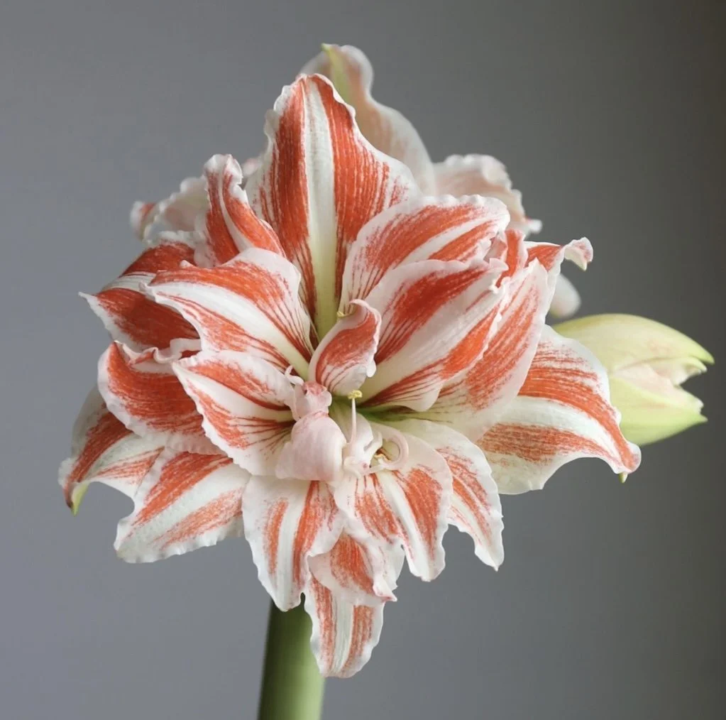 Dancing Queen is a Dutch Amaryllis and generally blooms in January/February. Dancing Queen has been a hard to find Amaryllis for me because she always sells out so quickly! But last year I finally snagged her and it was well worth the effort because she is an absolute show stopper. She is a fully double variety with lively red stripes on ruffled, bright white petals that are reminiscent of a child’s pinwheel. These large blooms are 6-7 inches in diameter!